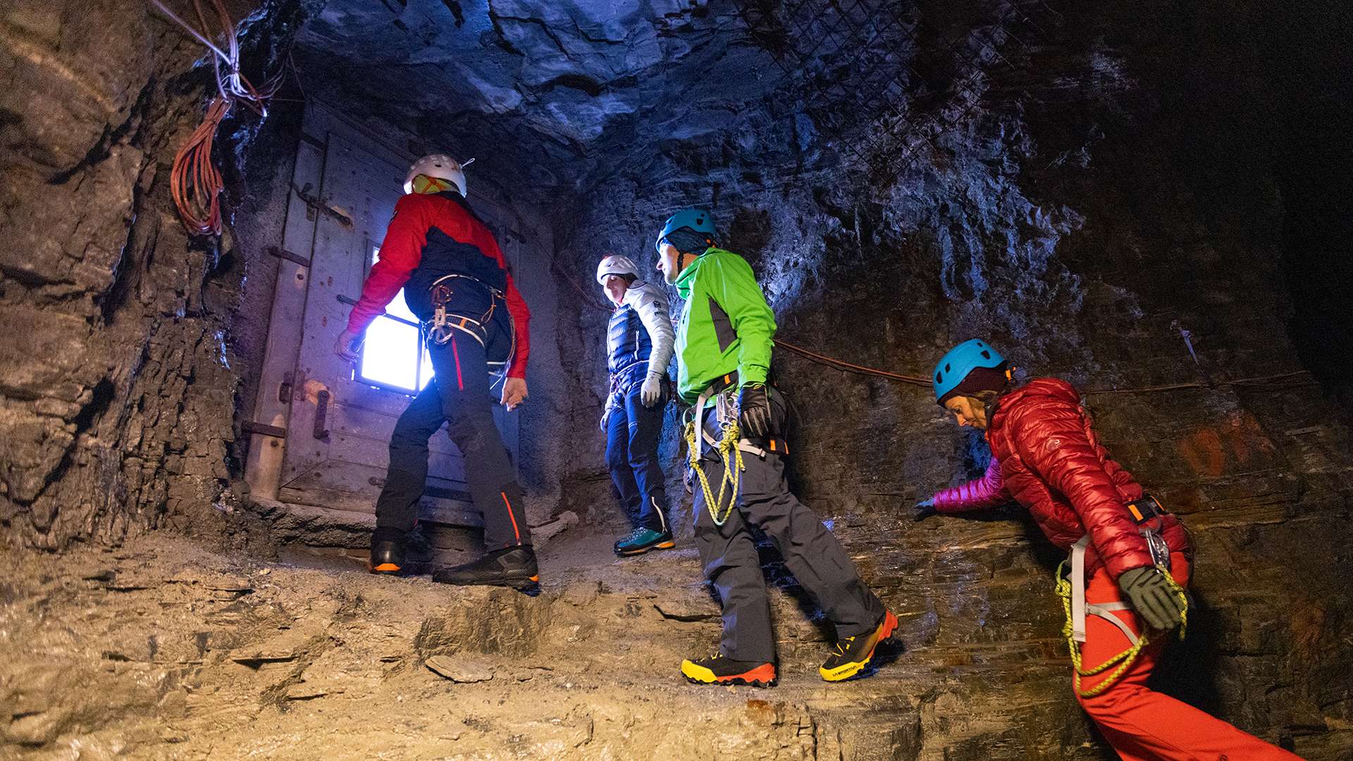 ![]() | Climber enters the Eiger north face via suspend fun gate, wearing a harness and gets a Continuation backpack |