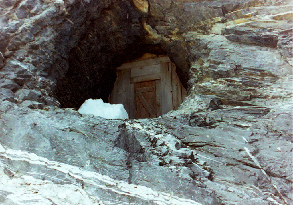 This is the Stollenloch door, a wooden door on a hole drilled in the rock of the Bernese alps. It was made when the Swiss built the train track1 that goes up to the Jungfraujoch observatory: